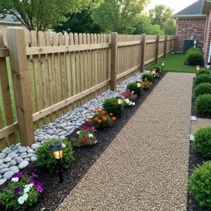 Incorporate decorative stones, gravel, or stepping paths along your fence line to create a clean and structured look.
