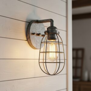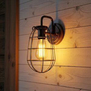 The cage protects the bulb while adding a decorative industrial flair, and when paired with a warm copper or aged bronze finish, it complements weathered wood and neutral tones beautifully.