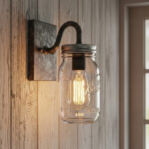 These mason jar wall sconces often feature a simple metal or wood backing with one or more glass jars housing the bulb.