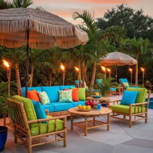 A palapa or thatched umbrella adds to the tropical feel, while tiki torches or lanterns create evening ambiance.
