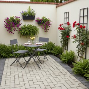 Opt for space-saving furniture like foldable chairs or built-in benches, and use vertical space with wall planters or trellises.