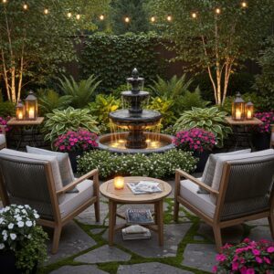 Surround the water feature with lush plants, soft lighting, and comfortable seating to amplify the calming atmosphere.