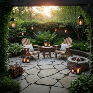 A rustic stone patio creates a timeless and natural look that blends beautifully with the outdoors.
