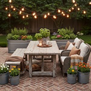 Use materials like reclaimed wood, brick pavers, and galvanized metal accents to achieve the look.
