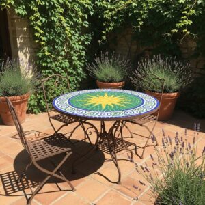 A Mediterranean-inspired patio adds warmth and charm with terracotta tiles, wrought-iron furniture, and colorful mosaic accents.