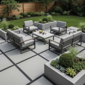 Think sleek concrete pavers, neutral color palettes, and simple yet stylish furniture.