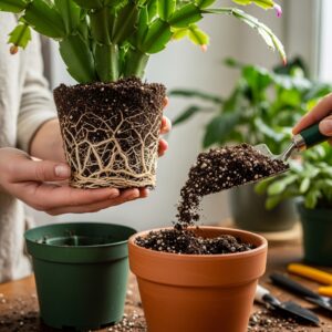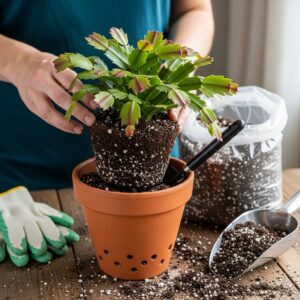 If your Christmas cactus looks root-bound or the soil compacts easily, it’s time to repot.