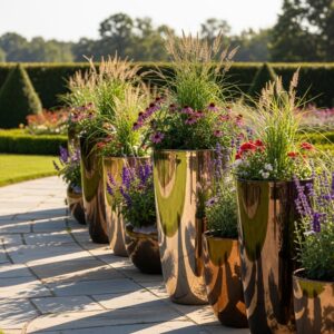 Metal planters — like those made from copper, brass, or powder-coated steel — can add an industrial chic or elegant look to your garden.