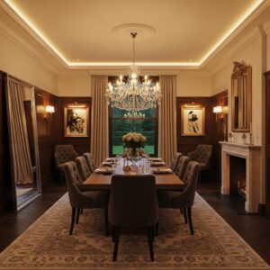 A dining room for eight is all about balance — comfort, space, and visual harmony.