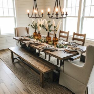 Create a stylish and inviting setup by mixing different seating types — for example, combine six chairs with a bench on one side or use upholstered chairs at the ends for a formal touch.