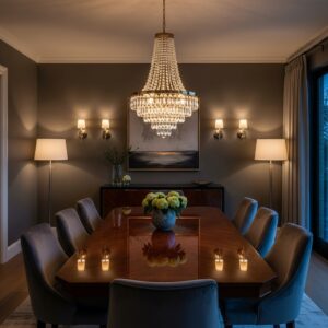 In addition to your chandelier, add wall sconces or floor lamps to brighten corners and enhance ambiance.