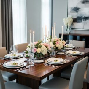 Incorporate cozy elements like upholstered chairs, linen table runners, or velvet cushions.