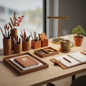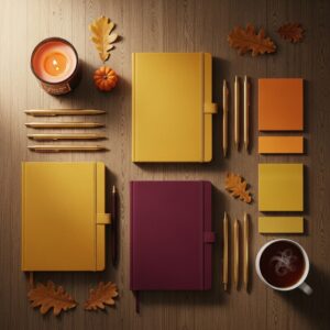 Think notebooks in warm hues, golden pens, or sticky notes in shades of orange and brown. Even small swaps can make a big difference.