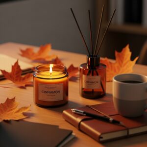 Place a candle or diffuser with fall-inspired scents like cinnamon, apple spice, pumpkin latte, or vanilla on your desk (or a safe spot).