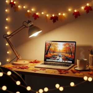 String fairy lights around your desk area or place a small warm-toned lamp to create that perfect autumn glow.