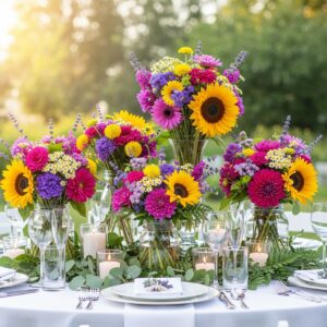 Choose seasonal flowers in coordinating colors and arrange them in vases, mason jars, or teapots for a whimsical touch.