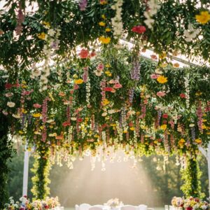 Decorate ceilings or outdoor spaces with hanging flower garlands.