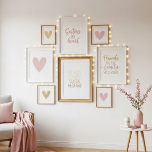 Frame simple friendship quotes, minimalist heart prints, or soft watercolor artwork. Use light wood or white frames to keep the look airy and cozy.
