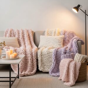Choose plush materials like fleece, faux fur, or chunky knit throws in shades of blush pink, cream, lavender, or warm beige.
