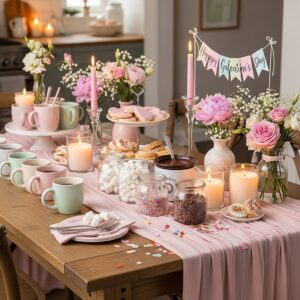 Add a soft runner, a small tray, and decorative jars filled with marshmallows or cocoa powder. Include cute mugs in pastel or neutral tones and maybe a small candle or flowers nearby.