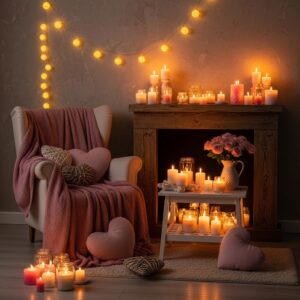 Add a soft chair or bench with pillows, a throw blanket, and subtle Galentine’s decor like heart garlands or fairy lights.