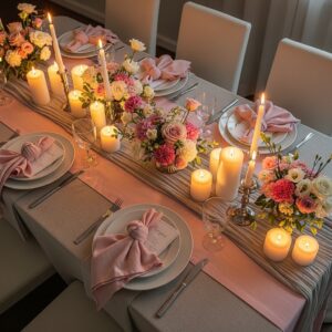 Start with a soft tablecloth or runner, then add placemats, cloth napkins, and simple centerpieces like candles or small flowers.