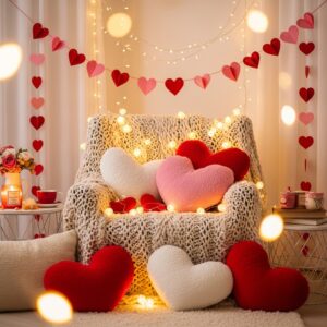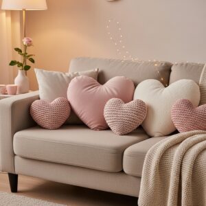 Look for heart-shaped pillows or ones with embroidered hearts, love quotes, or soft patterns in cozy fabrics like velvet or knit.