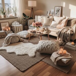 Even if you already have a rug, layering a smaller faux fur or textured rug on top adds extra coziness.