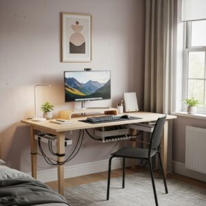 Use cable sleeves, clips, or under-desk trays to keep wires hidden and organized.