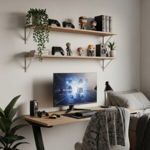 Install floating shelves above the desk or bed to store games, controllers, collectibles, and décor items.