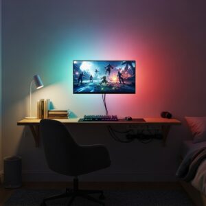 Pairing RGB lights with warm fairy lights can create a balanced glow that feels both cozy and exciting for late-night gaming sessions.