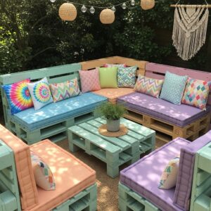 Sand the pallets, stack them securely, and paint them in soft pastel or neutral tones.