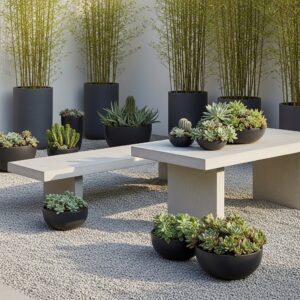 Add contrast with potted succulents or bamboo planters.