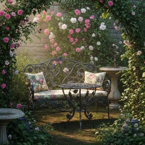 Choose wrought iron or aluminum with intricate designs and pair them with floral cushions for comfort.