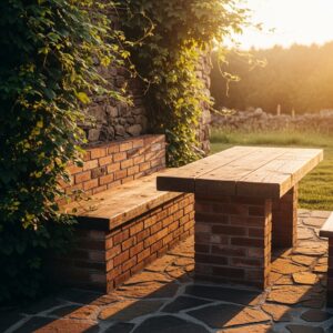 11. Recycled Brick Bench and Wooden Table