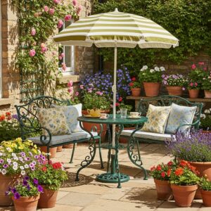 Add patterned cushions and a small umbrella for comfort.