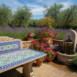 For a Mediterranean-inspired look, opt for a stone bench paired with a colorful mosaic table.