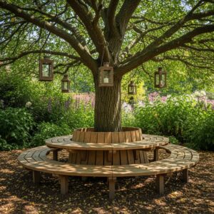 Build a circular bench and table around a tree trunk to create a shaded, natural seating area.