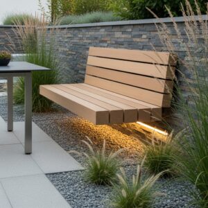 A modern floating bench and table design adds sophistication to minimalist gardens.