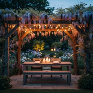 Add climbing plants like wisteria or jasmine to create natural shade and fragrance.