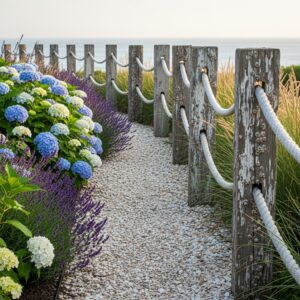 For a simple, coastal-inspired fence, use thick rope strung between wooden posts.