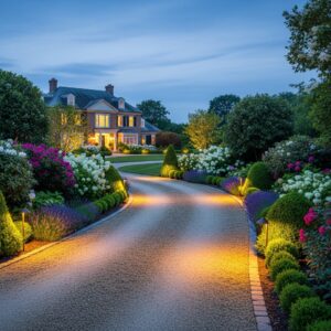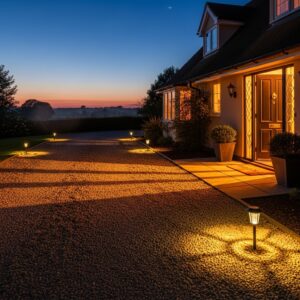 Solar-powered path lights, lantern posts, or in-ground LED lights can be installed along the driveway edges to guide vehicles at night while highlighting the texture of the gravel.