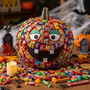 Give your pumpkin a snack-loving personality by gluing empty chip bags, candy wrappers, or snack-sized treats around its “mouth.”
