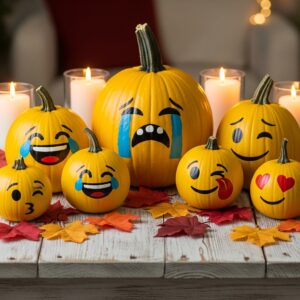 These funny emoji pumpkins are easy, recognizable, and perfect for modern Halloween humor.