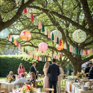 Hanging paper lanterns, tassel garlands, or floral hoops from trees or pergolas adds dimension and visual interest.