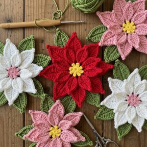 Crochet small poinsettia flowers using red, white, or pink yarn.