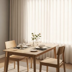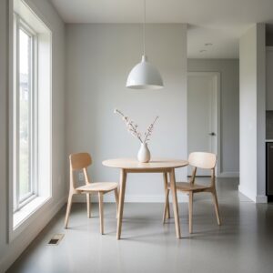 Neutral tones like beige, white, gray, or light wood make small dining spaces feel larger and calmer.