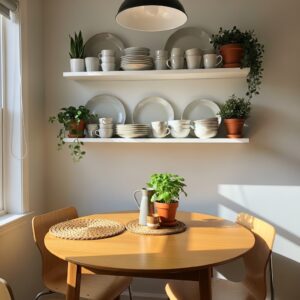 When space is tight, install floating shelves above or beside your table to store dishes, cups, or decor.
