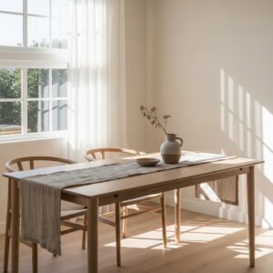 Add depth with textures — a linen tablecloth, woven placemats, or a cozy rug.