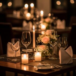 For special dinners, keep the setup minimal but thoughtful — a pair of candles, linen napkins, and matching plates.